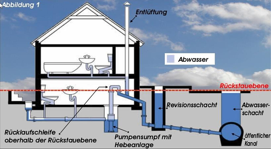Die Rückstauebene ist als die höchste Ebene definiert, bis zu der das Wasser in einer Entwässerungsanlage ansteigen kann. Dies ist die jeweilige Straßen- bzw. Gehwegoberkante vor dem Grundstück. Bei stark geneigtem Gelände kann das Abwasser allerdings auch bis zu dem bergauf liegenden Kontrollschacht in der Straße / Kanalhaltung, an der die Grundstücksentwässerung angeschlossen ist, steigen. Erst hier tritt