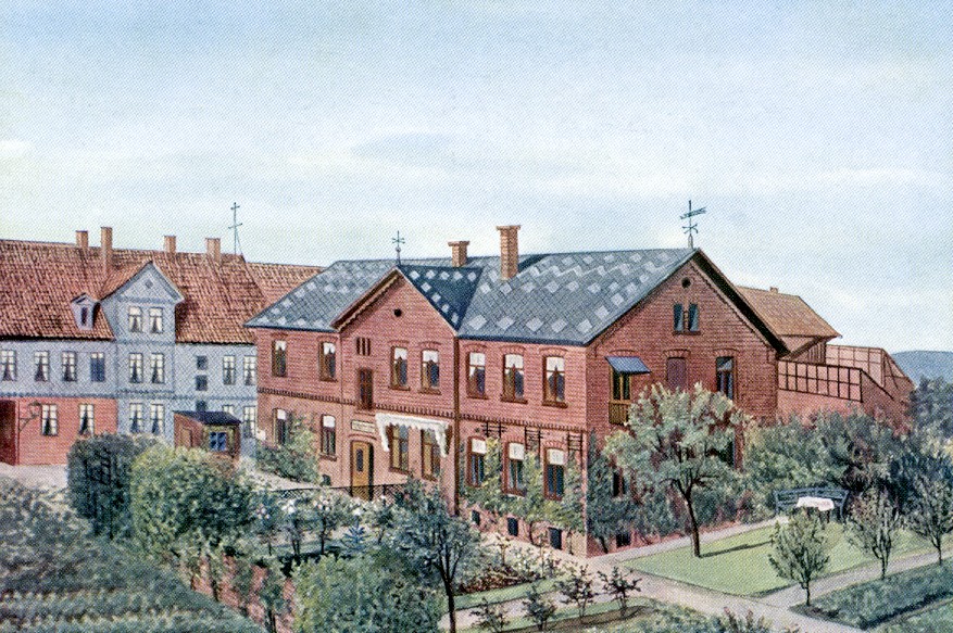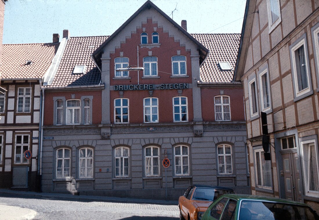 Das vorliegende Gebäude wurde 1902 vollendet. Auf den Erbauer Christian Jenssen weisen die verschlungenen Initialen CJ hin; eine Eule als Symbol der Buchdruckerkunst ziert ebenfalls die Fassade.