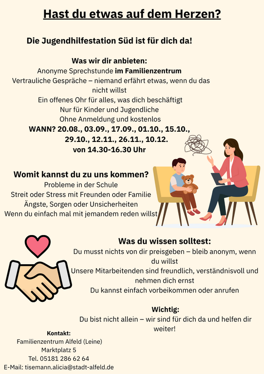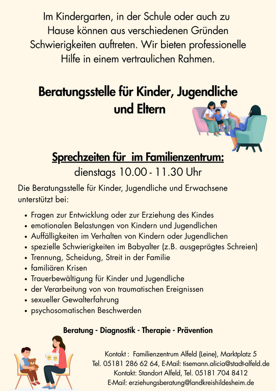 Die Beratungsstelle für Kinder, Jugendliche und Eltern bietet Beratung in den Themen Entwicklung, Erziehung, Trennung und Scheidung, Trauerbewältigung und Gewalterfahrung.
