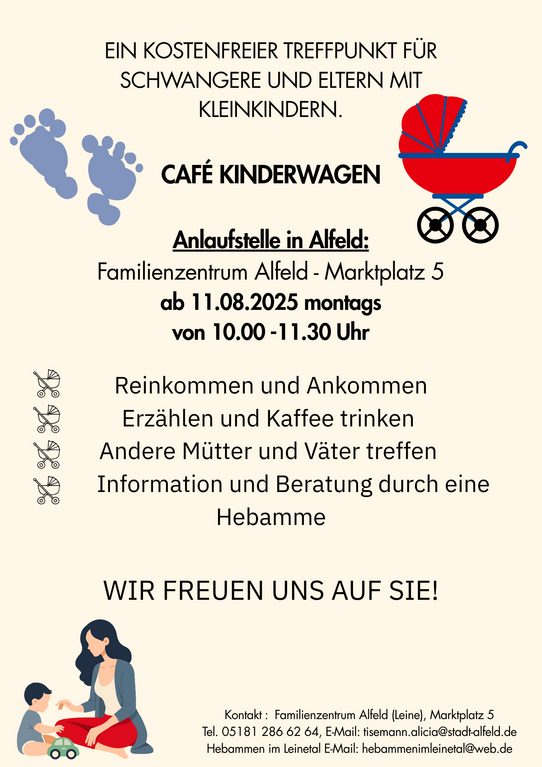 Das Café Kinderwagen bietet einen kostenfreien Treffpunkt für Schwangere und Eltern mit Kleinkindern. Erzählen und Kaffee trinken, andere Mütter und Väter kennenlernen, Information und Beratung durch eine Hebamme.