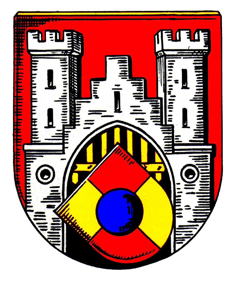 In Rot einsilbernes Stadttor mit zwei viereckigen Zinnentürmen rechts und links und einem gotischem Treppengiebel inmitten. Im spitzbogigen Torraum ein goldenes Fallgatter, davor lehnt schräg nach rechts ein halbrunder Wappenschild, von Gold und Rot quadriert, in der Mitte mit einer blauen, gebuckelten Scheibe belegt.